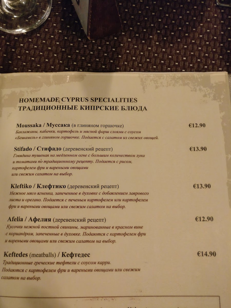 Dining at Palm Grove Restaurant offers a wonderfully diverse menu that caters to every taste. For starters, the homemade soups, such as Vegetable Soup and Chicken Soup, set a comforting tone, while refreshing salads like Tuna Salad, Caesar’s Salad, and Greek Village Salad bring a crisp, vibrant touch to the table. The special chef’s recommendations-notably Chicken Curry, Chicken Wings, and Sweet and Sour Chicken-showcase bold flavors, complemented by the hearty charcoal grills including Special Mixed Grill and Grilled Chicken Fillet. Pasta lovers will appreciate the homemade fresh pasta options, from Ravioli Porcini to Spaghetti Carbonara and Spaghetti Bolognaise, while pizza enthusiasts can enjoy Fresh Homemade Pizzas like Make Your Own Pizza, Pepperoni, and the Margherita Special Pizza. The homemade beef burgers-Cheese Beef Burger, Jack Daniel’s Beef Burger, and Beef Burger BBQ-offer a satisfying, indulgent choice, alongside the crispy chicken fillet burger. Traditional tastes are honored with homemade Cyprus specialities, such as Meatballs and Kleftiko, and the kebabs special, featuring Battered Fish and Chips and Gyros in Cypriot Pita, adds a local flair. To round out the meal, the menu provides a selection of steaks like Grilled Rib Eye Steak and Beef Stroganoff, as well as sides including Rice and Onion Rings. Refreshing beverages, from KEO 330ml and Calsberg 330ml beers to soft drinks like Pepsi Max 330ml, 7up 330ml, and Fanta Orange 330ml, complete the dining experience. Overall, the menu at Palm Grove Restaurant strikes a balance between traditional Cypriot flavors, international favorites, and creative chef specials, making it a versatile and satisfying choice for any diner.